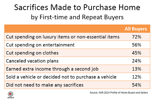 The motivation is so dominant that buyers are willing to make sacrifices to have their dream come true. According to the 2014 National Association of REALTORS® Home Buyers and Sellers Survey, 72% of first-time buyers cut spending on luxury or non-essential items. They also cut spending on entertainment, clothes and even cancelled vacation plans.